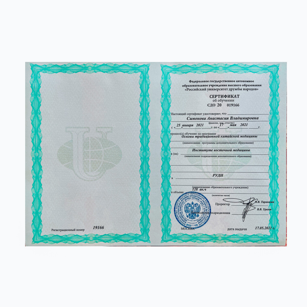 + Имеет государственное образование по Традиционной Китайской Медицине ИВМ РУДН (Института Восточной Медицины Российского Университета Дружбы Народов)